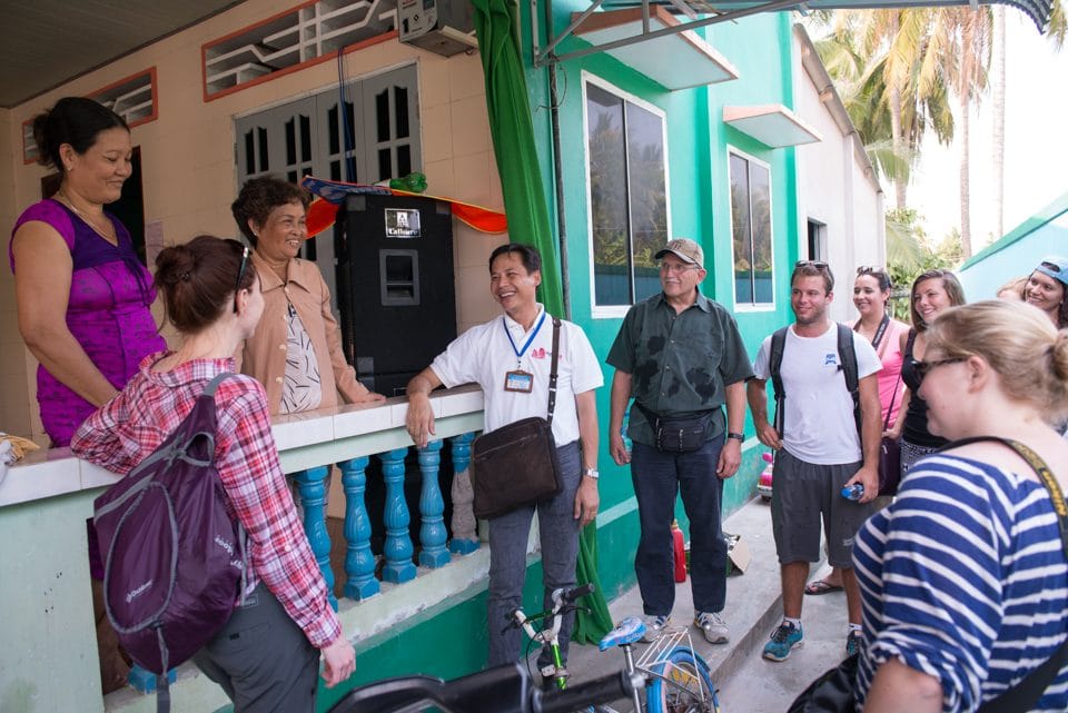 Voyagers met with one of Kiva’s field partners, East Meets West (EMW), a non-profit based in the United States and Viet Nam that uses Kiva funding in their Clean Water and Sanitation Program. EMW works on a community hygiene output based aid (CHOBA) model in which small groups are given rebates as financial incentives to improve their sanitation conditions. EMW also works with the local Women’s Unions to educate communities about changing their hygiene behavior. After improved sanitation results are verified, financial incentives are awarded to go towards projects benefiting the entire community, such as bathrooms in schools. Kiva is directly involved in the CHOBA model in Hai Duong province in north Viet Nam by providing loans to groups of low-income women.