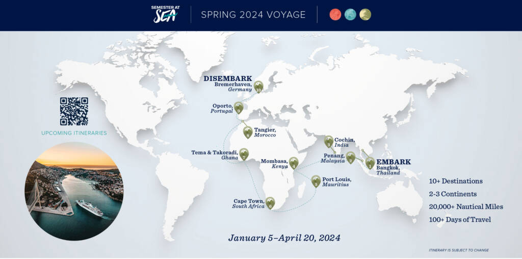 While I have you, I also want to share an update on our Fall 2023 voyage. The MV World Odyssey just departed Grand Canary Island and is heading toward a new port stay in South Africa. As you’ll notice in our adjusted itinerary for this voyage, while the fall voyage initially looked quite different from your own, students are now excitedly preparing for ports also on the Spring 2024 itinerary.
